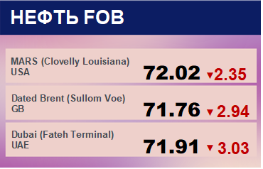 Цены на нефть сорта WTI с базиса поставки Кушинг упали на -3.4 до 68.43 долларов за баррель. Тренд на рынке WTI медвежий. Цены на нефть сорта Brent с поставкой из портов ЕС упали на -2.33 до 72.56 долларов за баррель. Тренд на рынке Brent падающий. Цены на корзину сортов нефти стран членов ОПЕК упали на -2.51 до 71.51 долларов за баррель. Ценовая тенденция по корзине ОПЕК направлена вниз. Цена на сорт MARS упала на -2.35 до 72.02 долларов за баррель. Цена на сорт Oman упала на -3.01 до 70.93 долларов за баррель. Сорт марки Dubai подешевел на -3.03 до 71.91 долларов за баррель.