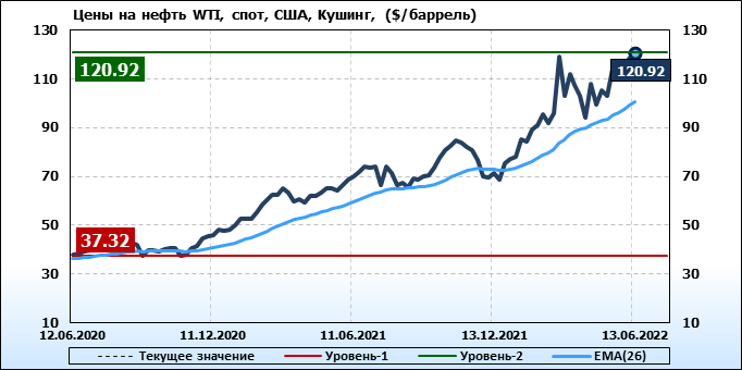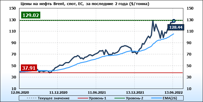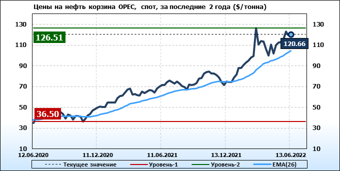 «Средняя цена на нефть Urals за период мониторинга с 15 мая 2022 года по 14 июня 2022 года составила 87,491 доллара за баррель, или 638,7 доллара за тонну», — поясняет министерство.