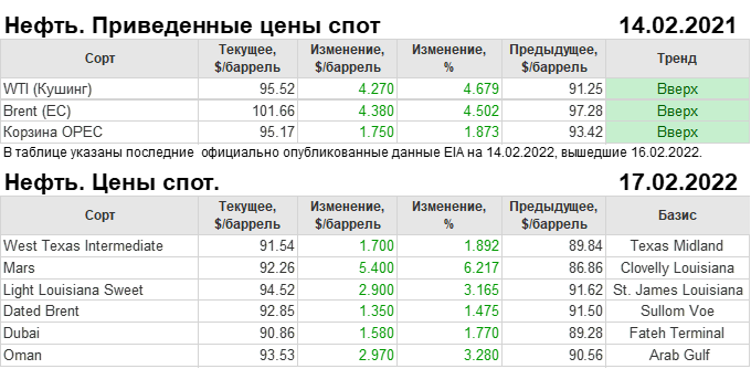 Нефть. Мировые цены спот по сортам и базисам. Данные на 17.02.2022