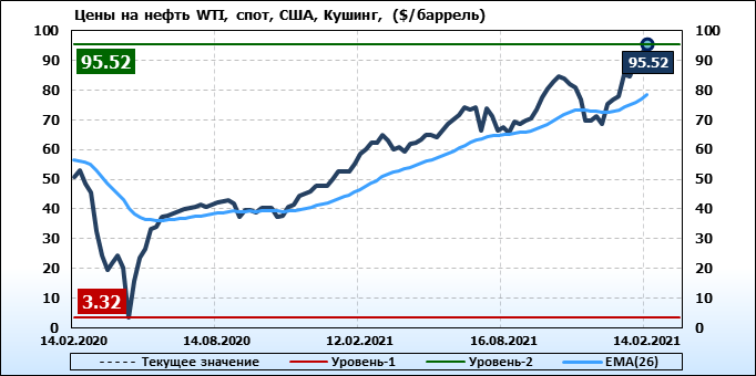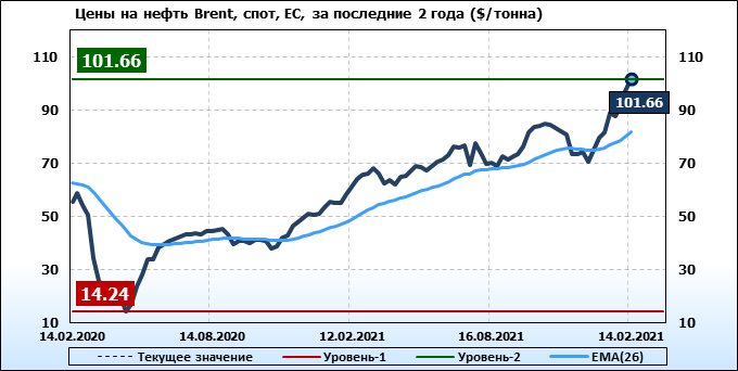 Сорт нефти Brent с отгрузкой в конкретную дату (Dated Brent) впервые с сентября 2014 года начали продавать по цене выше ста долларов за баррель. По состоянию на 16 февраля ее стоимость достигла 100,705 доллара, свидетельствуют подсчеты агентства Platts.