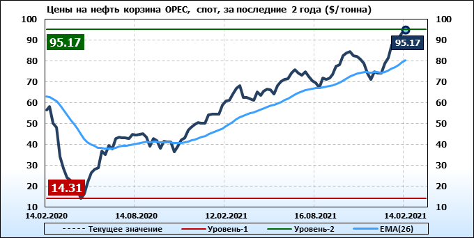 Цены на нефть сорта WTI с базиса поставки Кушинг выросли на 4.27 до 95.52 долларов за баррель. Тренд на рынке WTI бычий. Цены на нефть сорта Brent с поставкой из портов ЕС выросли на 4.38 до 101.66 долларов за баррель. Тренд на рынке Brent растущий. Цены на корзину сортов нефти стран членов ОПЕК выросли на 1.75 до 95.17 долларов за баррель. Ценовая тенденция по корзине ОПЕК направлена вверх. Цена на сорт MARS выросла на 5.4 до 92.26 долларов за баррель. Цена на сорт Oman выросла на 2.97 до 93.53 долларов за баррель. Сорт марки Dubai подорожал на 1.58 до 90.86 долларов за баррель.