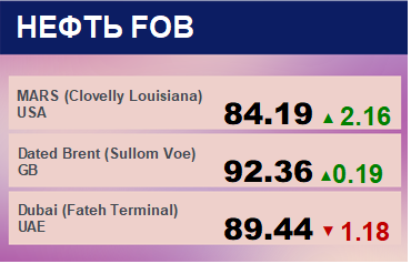 Цены на нефть сорта WTI с базиса поставки Кушинг упали на -5.95 до 85.85 долларов за баррель. Тренд на рынке WTI медвежий. Цены на нефть сорта Brent с поставкой из портов ЕС упали на -6.28 до 93.59 долларов за баррель. Тренд на рынке Brent падающий. Цены на корзину сортов нефти стран членов ОПЕК упали на -2.9 до 94.42 долларов за баррель. Ценовая тенденция по корзине ОПЕК направлена вниз. Цена на сорт MARS выросла на 2.16 до 84.19 долларов за баррель. Цена на сорт Oman упала на -0.48 до 87.13 долларов за баррель. Сорт марки Dubai подешевел на -1.18 до 89.44 долларов за баррель.