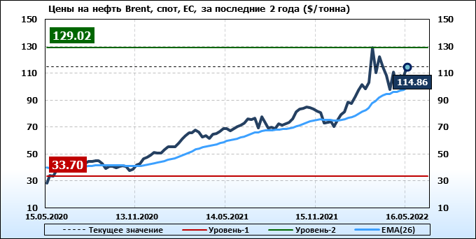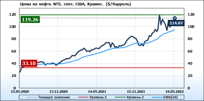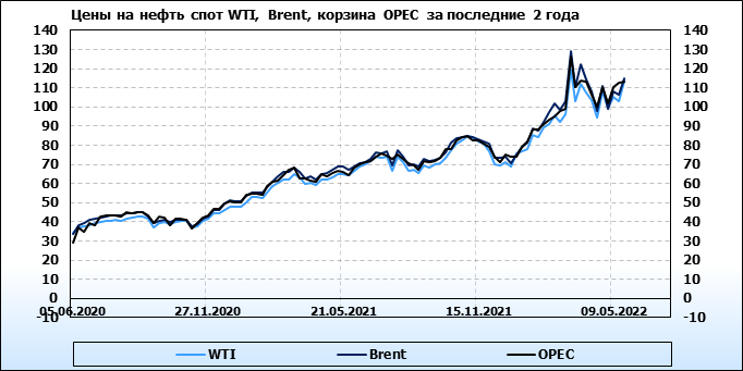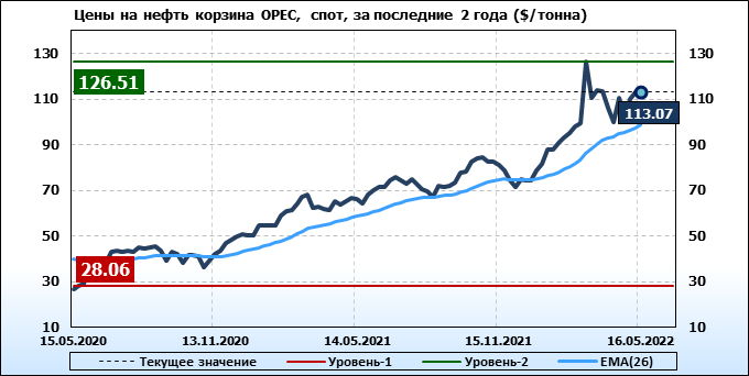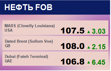 Цены на нефть сорта WTI с базиса поставки Кушинг выросли на 10.99 до 114.07 долларов за баррель. Тренд на рынке WTI бычий. Цены на нефть сорта Brent с поставкой из портов ЕС выросли на 8.19 до 114.86 долларов за баррель. Тренд на рынке Brent растущий. Цены на корзину сортов нефти стран членов ОПЕК выросли на 0.59 до 113.07 долларов за баррель. Ценовая тенденция по корзине ОПЕК направлена вверх. Цена на сорт MARS выросла на 3.03 до 107.59 долларов за баррель. Цена на сорт Oman выросла на 0.95 до 105.83 долларов за баррель. Сорт марки Dubai подорожал на 6.45 до 106.88 долларов за баррель.