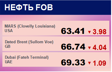 Цены на нефть сорта WTI с базиса поставки Кушинг выросли на 0.88 до 67.44 долларов за баррель. Тренд на рынке WTI бычий. Цены на нефть сорта Brent с поставкой из портов ЕС выросли на 0.42 до 70.07 долларов за баррель. Тренд на рынке Brent растущий. Цены на корзину сортов нефти стран членов ОПЕК упали на -1.01 до 69.65 долларов за баррель. Ценовая тенденция по корзине ОПЕК направлена вверх. Цена на сорт MARS упала на -3.98 до 63.41 долларов за баррель. Цена на сорт Oman упала на -2.9 до 67.4 долларов за баррель. Сорт марки Dubai подешевел на -1.09 до 69.33 долларов за баррель.