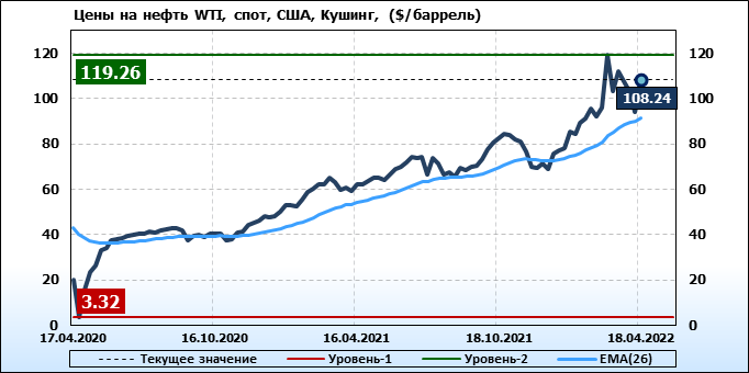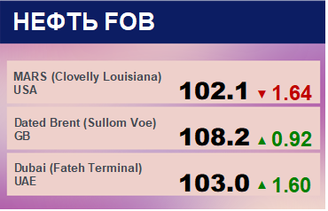 Цены на нефть сорта WTI с базиса поставки Кушинг выросли на 14.02 до 108.24 долларов за баррель. Тренд на рынке WTI бычий. Цены на нефть сорта Brent с поставкой из портов ЕС выросли на 12.91 до 110.83 долларов за баррель. Тренд на рынке Brent растущий. Цены на корзину сортов нефти стран членов ОПЕК выросли на 10.46 до 110.54 долларов за баррель. Ценовая тенденция по корзине ОПЕК направлена вверх. Цена на сорт MARS упала на -1.64 до 102.16 долларов за баррель. Цена на сорт Oman упала на -2.01 до 104.06 долларов за баррель. Сорт марки Dubai подорожал на 1.6 до 103.09 долларов за баррель.