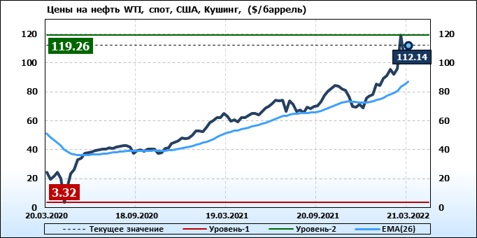 Цены на нефть сорта WTI с базиса поставки Кушинг выросли на 8.92 до 112.14 долларов за баррель. Тренд на рынке WTI бычий. Цены на нефть сорта Brent с поставкой из портов ЕС выросли на 11.9 до 122.29 долларов за баррель. Тренд на рынке Brent растущий. Цены на корзину сортов нефти стран членов ОПЕК выросли на 3.14 до 113.81 долларов за баррель. Ценовая тенденция по корзине ОПЕК направлена вверх. Цена на сорт MARS выросла на 19.29 до 112.13 долларов за баррель. Цена на сорт Oman выросла на 19.17 до 116.93 долларов за баррель. Сорт марки Dubai подорожал на 5.67 до 111.43 долларов за баррель.
