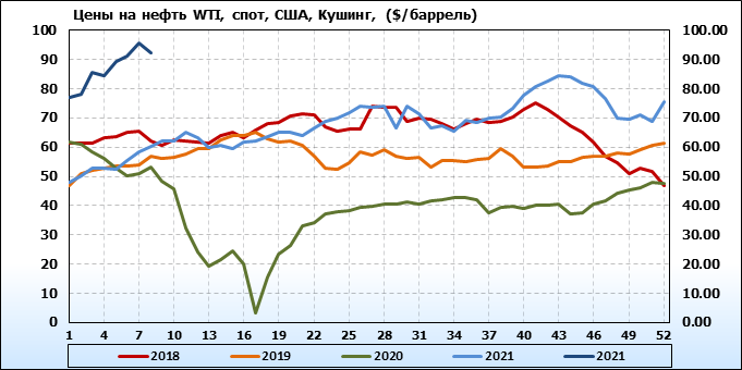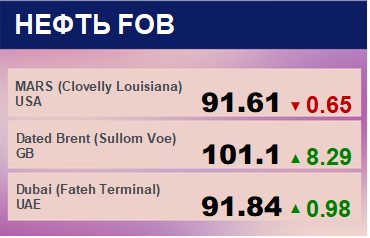 Цены на нефть сорта WTI с базиса поставки Кушинг упали на -3.41 до 92.11 долларов за баррель. Тренд на рынке WTI бычий. Цены на нефть сорта Brent с поставкой из портов ЕС упали на -2.93 до 98.73 долларов за баррель. Тренд на рынке Brent растущий. Цены на корзину сортов нефти стран членов ОПЕК выросли на 2.77 до 97.94 долларов за баррель. Ценовая тенденция по корзине ОПЕК направлена вверх. Цена на сорт MARS упала на -0.65 до 91.61 долларов за баррель. Цена на сорт Oman выросла на 1.05 до 94.58 долларов за баррель. Сорт марки Dubai подорожал на 0.98 до 91.84 долларов за баррель.