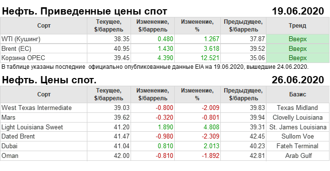 Нефть. Мировые цены спот по сортам и базисам. Данные на 26.06.2020
