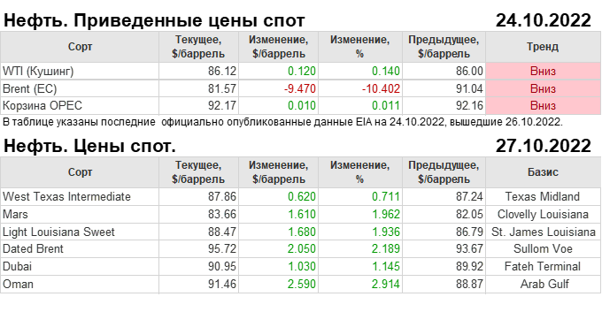 Нефть. Мировые цены спот по сортам и базисам. Данные на 27.10.2022