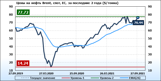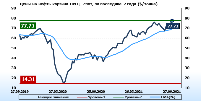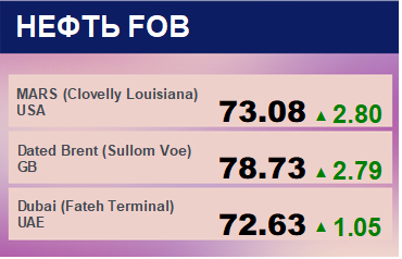 Цены на нефть сорта WTI с базиса поставки Кушинг выросли на 3.02 до 73.43 долларов за баррель. Тренд на рынке WTI бычий. Цены на нефть сорта Brent с поставкой из портов ЕС выросли на 2.85 до 76.44 долларов за баррель. Тренд на рынке Brent растущий. Цены на корзину сортов нефти стран членов ОПЕК выросли на 4.26 до 77.73 долларов за баррель. Ценовая тенденция по корзине ОПЕК направлена вверх. Цена на сорт MARS выросла на 2.8 до 73.08 долларов за баррель. Цена на сорт Oman выросла на 1.63 до 75.87 долларов за баррель. Сорт марки Dubai подорожал на 1.05 до 72.63 долларов за баррель.