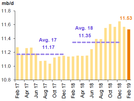По предварительным данным, объемы производства жидких видов топлива в России в январе и феврале 2019 года возросли на 0.40 млн. баррелей в день.