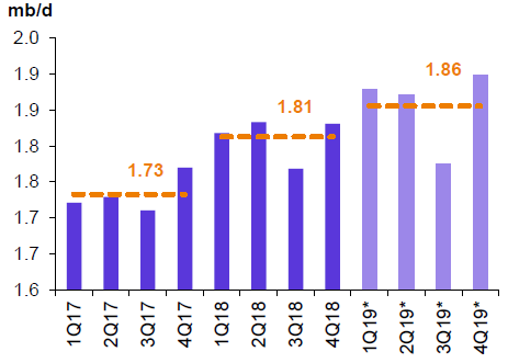 Соответственно, ожидается, что в 2019 году объемы производства жидких видов топлива в Казахстане возрастут лишь на 0.04 млн. баррелей в день до 1.85 млн. баррелей в день.