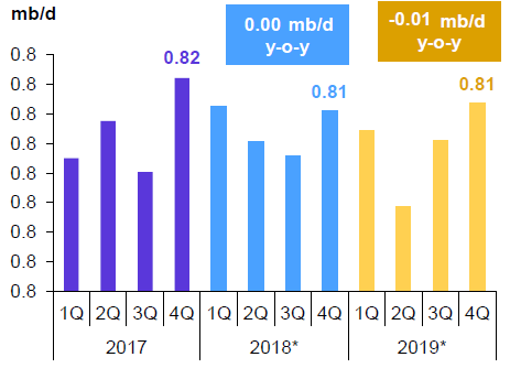 Ожидается, что в 2019 году объемы производства жидких видов топлива в Азербайджане останутся без изменений или незначительно сократятся на 0.01 млн. баррелей в день. Общий показатель составит 0.80 млн. баррелей в день.