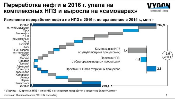 «В 2016 году объем нефтепереработки в России снизился на 3,5 млн т до 279 млн т за счет сокращения загрузки комплексных НПЗ», — говорится в исследовании. В основном это касается наименее эффективной части первичной переработки, недостаточно покрытой вторичными процессами, которая имела отрицательную маржу в ценовых и налоговых условиях 2016 года.
