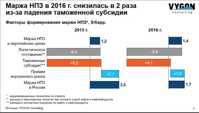 К снижению маржи, в свою очередь, привело падение таможенной субсидии. Как пишет «Ъ», «эта субсидия формируется благодаря тому, что ставка экспортной пошлины на светлые нефтепродукты на треть ниже пошлины на нефть. Поскольку размер пошлины зависит от цены нефти, при ее удешевлении субсидия в абсолютных цифрах тоже сокращается». Однако в 2017 году аналитики Vygon Consulting ожидают рост маржи до $3 за баррель, а в 2018 ее увеличения до $3,3 за баррель.