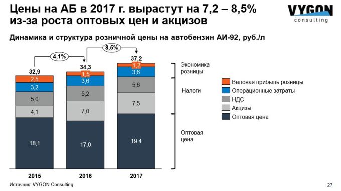 «Рост цены на автобензин АИ-92 в России в 2017 году экономически обоснован», — считают эксперты. Основные причины они видят в увеличении европейских цен, снижении таможенных пошлин, а также отложенном эффекте по переносу прошлогоднего роста акциза.