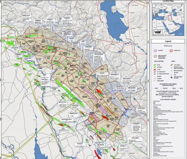 Курдское региональное правительство (КРГ) заключило сделки с международными нефтяными компаниями на разработку месторождений в пределах автономной зоны, без каких-либо вмешательств со стороны Багдада. Крупные сделки были заключены с американскими компаниями и Турцией, которые являются главными клиентами курдской нефти и ее основным транзитным маршрутом.