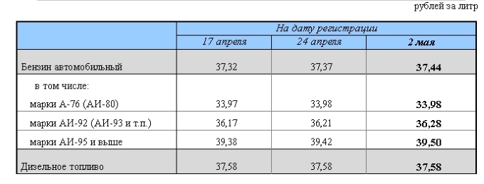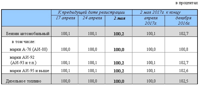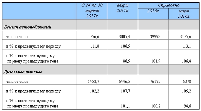 Федеральная служба государственной статистики представляет данные еженедельного мониторинга производства нефтепродуктов и потребительских цен на них за неделю с 24 по 30 апреля 2017 года.