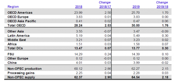В 2019 году показатель роста предложения в странах, не входящих в ОПЕК, был пересмотрен в сторону снижения на 0.06 млн. баррелей в день до 2.18 млн. баррелей в день. Это обусловлено техническими работами на производствах в Казахстане (-111 тыс. баррелей в день), а также снижением показателей в Бразилии (-57 тыс. баррелей в день) и Канаде (-23 тыс. баррелей в день). Вместе с тем, прогноз для России, и США был пересмотрен в сторону увеличения.
