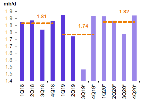 Ожидается, что в 2019 году объемы нефтедобычи в Азербайджане сократятся на 0.01 млн. баррелей в день до 0.80 млн. баррелей в день. Данный показатель был несколько пересмотрен в сторону снижения по сравнению с предшествующим отчетом.