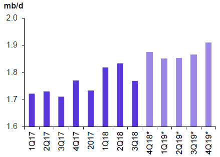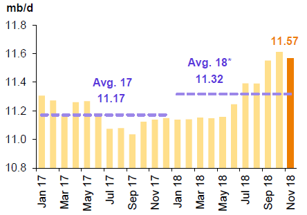 Вместе с тем, из-за решений, принятых группой  ОПЕК+ в начале декабря, объемы нефтедобычи в России в первой половине 2019 года будут на 230,000 баррелей в день меньше по сравнению с уровнем октября 2018 года.