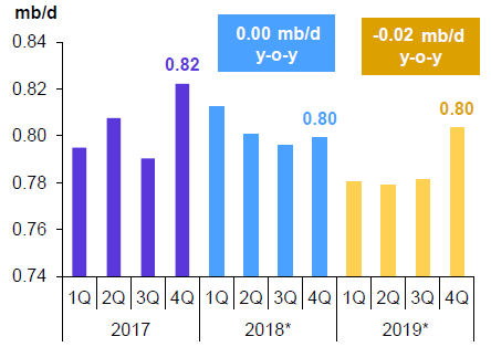 Ожидается, что в 2018 году объемы производства жидких видов топлива останутся также без изменений — 0.80 млн. баррелей в день.