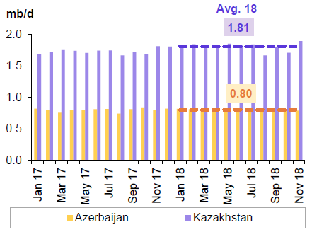 Объемы нефтедобычи в России и Казахстане возрастут на 0.16 млн. баррелей в день и 0.09 млн. баррелей в день до 11.33 млн. баррелей в день и 1.82 млн. баррелей в день соответственно. Объемы нефтедобычи в Казахстане останутся без изменений — 0.80 млн. баррелей в день.