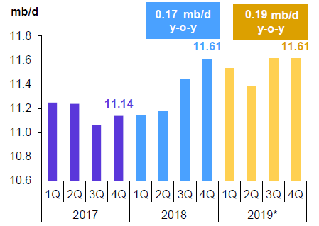 Ожидается, что в 2019 году объемы производства жидких видов топлива возрастут на 0.19 млн. баррелей в день до среднего уровня 11.53 млн. баррелей в день.
