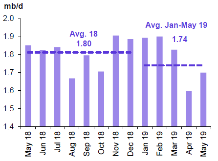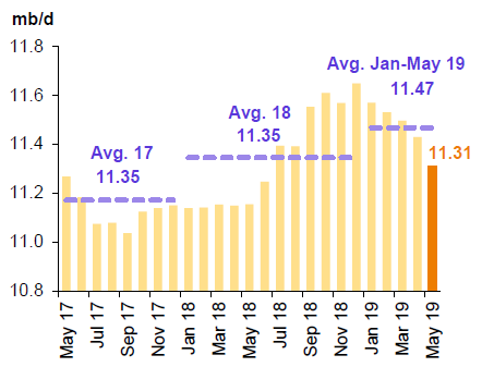 Во втором квартале 2019 года уровень предложения сократится на 0.15 млн. баррелей в день до 11.38 млн. баррелей в день. Данный показатель был пересмотрен в сторону снижения на 0.02 млн. баррелей в день по сравнению с предшествующим отчетом.