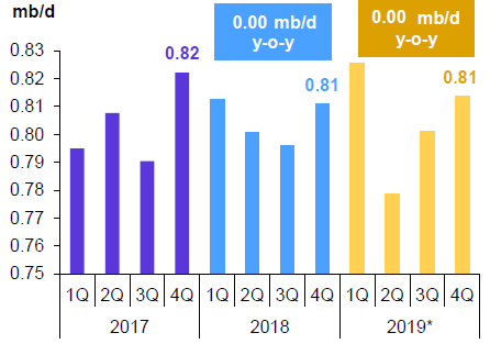 Основываясь на показателях первой половины 2019 года, а также на прогнозе об объемах нефтедобычи во второй половине года (в объеме 11.61 млн. баррелей в день), аналитики ожидают, что производительность в России в 2019 году возрастет на 0.19 млн. баррелей в день.