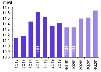 По прогнозам, объемы предложения в России вырастут лишь на 0,07 млн баррелей в сутки в среднем до 11,41 млн баррелей в сутки. В 2020 году ожидается рост на 0,09 мб/с в среднем до 11,50 мб/с.