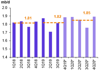 Объем предложения в третьем квартале был пересмотрен вверх на 65 мб/с. Соответственно, в третьем и четвертом кварталах 2019 года производительность выросла на 1,81 мб/с и 1,88 мб/с. Таким образом, объем предложения казахстанской нефти в текущем году вырастет на 0,01 млн баррелей в сутки до среднего значения в 1,82 млн баррелей в сутки.
