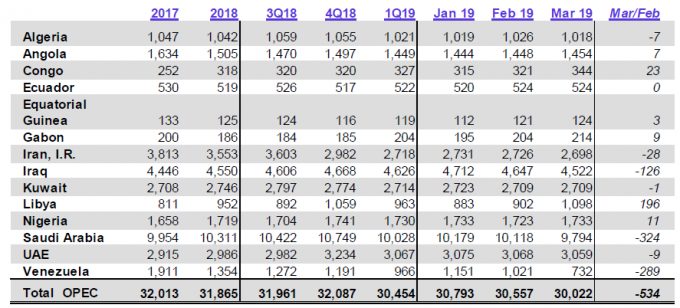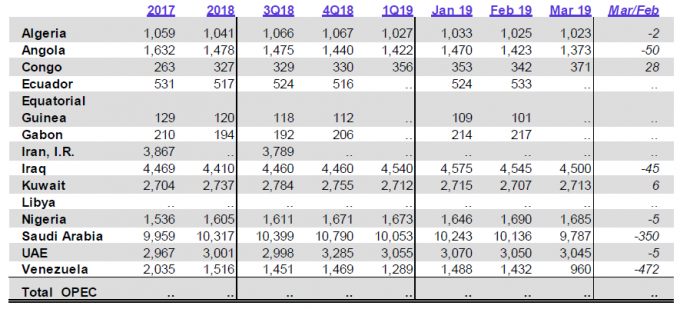 Объемы нефтедобычи в странах ОПЕК. Отчет ОПЕК от 10 апреля 2019