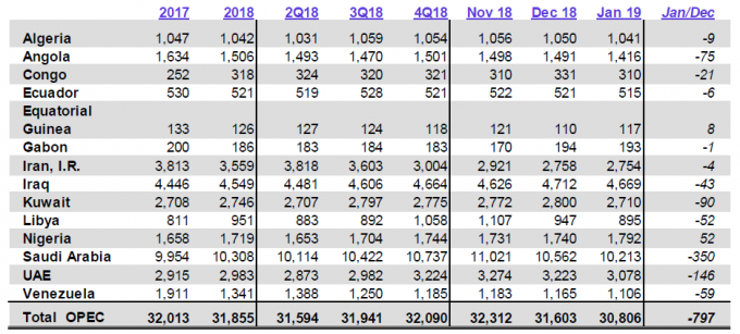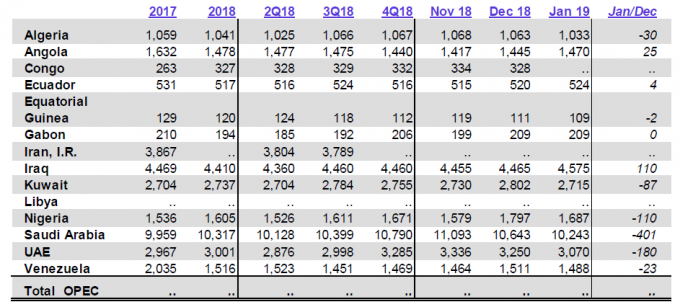 Объемы нефтедобычи в странах ОПЕК. Отчет ОПЕК от 12 февраля 2019