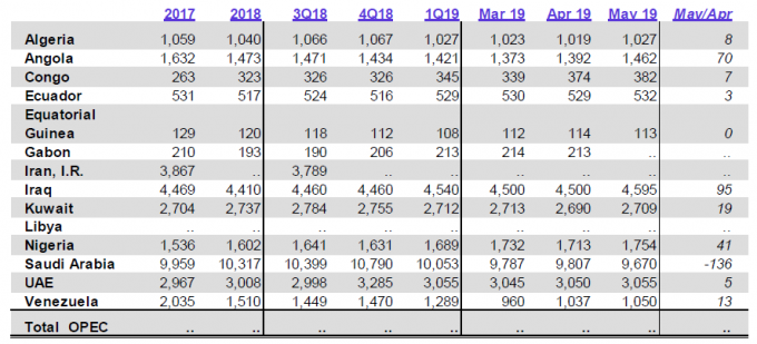 Объемы нефтедобычи в странах ОПЕК. Отчет ОПЕК от 13 июня 2019