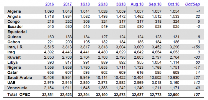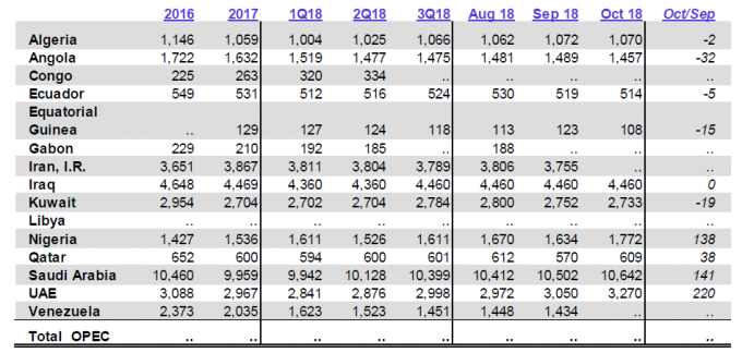 Объемы нефтедобычи в странах ОПЕК. Отчет ОПЕК от 13 ноября 2018