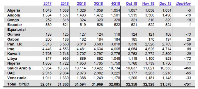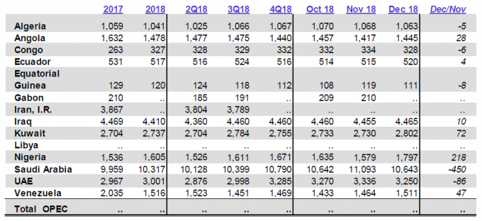 Объемы нефтедобычи в странах ОПЕК. Отчет ОПЕК от 17 января 2019