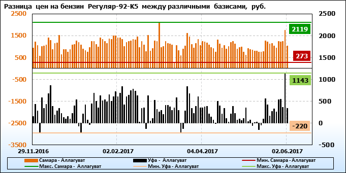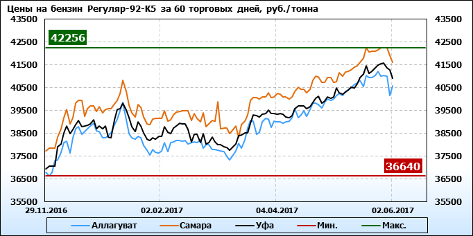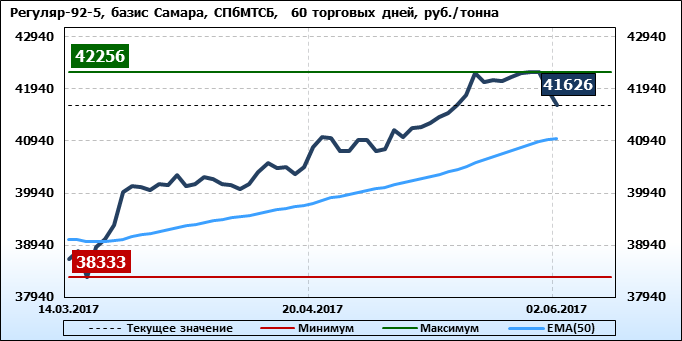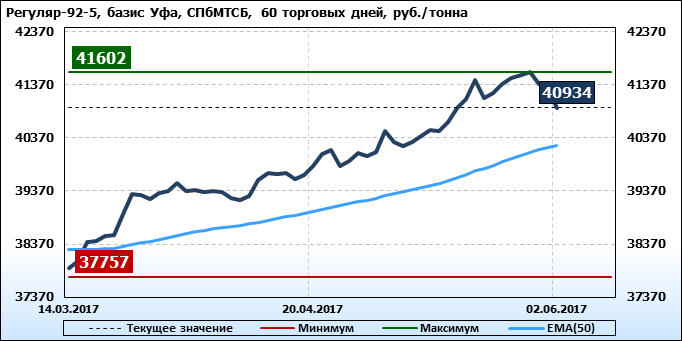 Обзор цен на бензин Регуляр-92-К5 за неделю, на площадке eOil и СПбМТСБ. Данные на 02.06.2017