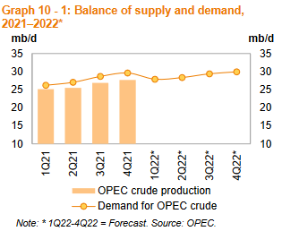 Во втором квартале 2021 года добыча нефти ОПЕК в среднем составляла 25,5 млн б/д, что на 1,5 млн б/д ниже спроса на нефть ОПЕК. В третьем квартале 2021 года добыча сырой нефти ОПЕК в среднем составляла 26,9 млн б/д, что на 1,8 млн б/д ниже спроса на нефть ОПЕК. В четвертом квартале 2021 года добыча сырой нефти ОПЕК в среднем составляла 27,7 млн б/д, что на 2,0 млн б/д ниже спроса на нефть ОПЕК. За весь 2021 год добыча нефти ОПЕК в среднем составила 26,3 млн б/д, что на 1,6 млн б/д ниже спроса на нефть ОПЕК.Спрос на нефть ОПЕК в 2022 году был пересмотрен в сторону повышения на 0,1 млн б/д по сравнению с предыдущим месяцем и составил 28,9 млн б/д, что примерно на 1,0 млн б/д выше, чем в 2021 году.