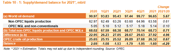 Согласно вторичным источникам, добыча нефти ОПЕК в среднем составляла 25,2 млн б/д в первом квартале 2021 г., что на 1,1 млн б/д ниже спроса на нефть ОПЕК за тот же период.