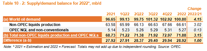 Спрос на нефть ОПЕК в 2022 году был пересмотрен в сторону повышения на 0,1 млн б/д по сравнению с предыдущим месяцем и составил 28,9 млн б/д, что примерно на 1,0 млн б/д выше, чем в 2021 году. По сравнению с предыдущей оценкой первый квартал 2022 года остался без изменений, а второй, третий и четвертый были пересмотрены в сторону повышения на 0,1 млн б/д каждая.