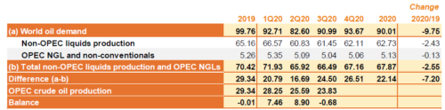 В сравнении с соответствующими кварталами 2019 года, спрос на нефть, добываемую в странах ОПЕК, в первом квартале 2020 года был на 8.4 млн. баррелей в день меньше; во втором квартале 2020 года — на 12.2 млн. баррелей в день меньше; в третьем квартале — на 5.9 млн. баррелей в день меньше; в четвертом квартале — будет на 2.4 млн. баррелей в день меньше.