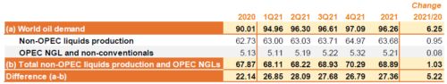 В сравнении с соответствующими кварталами 2020 года, спрос на нефть из стран ОПЕК в первом квартале 2021 года будет на 6.1 млн. баррелей в день больше; во втором квартале — на 11.4 млн. баррелей в день больше; в третьем квартале — на 3.2 млн. баррелей в день больше; в четвертом квартале — на 0.3 млн. баррелей в день больше.