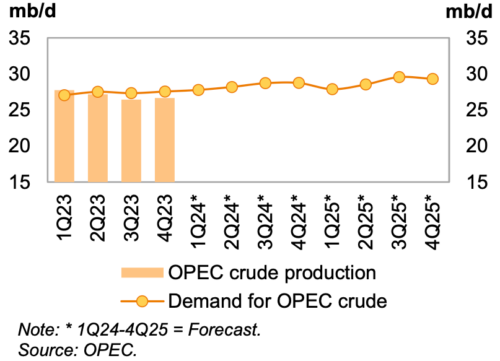 Спрос на нефть ОПЕК в 2024 году был пересмотрен в сторону понижения на 0,1 млн баррелей в сутки по сравнению с предыдущей оценкой и составил 28,4 млн баррелей в сутки, что примерно на 1,0 млн баррелей в сутки выше уровня, прогнозируемого на 2023 год.