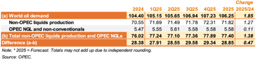 По сравнению с теми же кварталами 2024 года спрос на нефть ОПЕК в 1К25 и 2К25 прогнозируется на 0,1 млн баррелей в сутки и 0,3 млн баррелей в сутки соответственно. Ожидается, что спрос на нефть ОПЕК в 3К25 и 4К25 вырастет на 0,8 млн баррелей в сутки и 0,6 млн баррелей в сутки соответственно.
