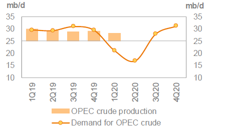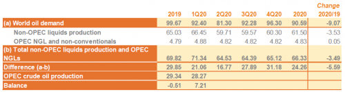В сравнении с соответствующими кварталами 2019 года, спрос на нефть из стран ОПЕК в первом квартале 2020 года будет на 8.5 млн. баррелей в день меньше, во втором квартале 2020 года — на 12.5 млн. баррелей в день меньше, в третьем квартале 2020 года — на 3.1 млн. баррелей в день меньше, а в четвертом квартале 2020 года — на 1.7 млн. баррелей в день больше.