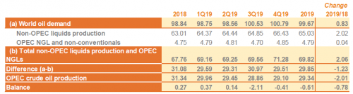 В сравнении с соответствующими кварталами 2018 года, спрос на нефть из стран ОПЕК в первом квартале 2019 года был на 2.1 млн. баррелей в день меньше, во втором квартале — на 1.7 млн. баррелей в день меньше, в третьем квартале — на 0.3 млн. баррелей в день меньше, в четвертом квартале — на 0.8 млн. баррелей в день меньше.