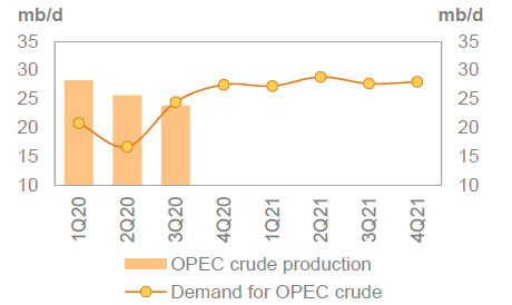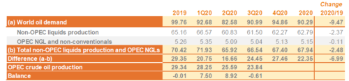 В сравнении с соответствующими кварталами 2019 года, спрос на нефть из стран ОПЕК в первом квартале 2020 года был на 8.4 млн. баррелей в день ниже; во втором квартале 2020 года — на 12.2 млн. баррелей в день ниже; в третьем квартале 2020 года — на 6.0 баррелей в день ниже; в четвертом квартале — будет на 1.4 млн. баррелей в день ниже.