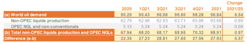 В сравнении с соответствующими кварталами 2020 года, ожидается, что спрос на нефть, добываемую в странах ОПЕК, в первом квартале 2021 года будет на 6.5 млн. баррелей в день выше; во втором квартале 2021 года — на 12.2 млн. баррелей в день выше; в третьем квартале 2021 года — на 0.5 млн. баррелей в день выше; в четвертом квартале 2021 года — на 5.6 млн. баррелей в день выше.
