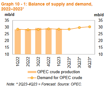Согласно вторичным источникам, добыча нефти ОПЕК в среднем составляла 28,8 млн б/д в первом квартале 2023 г., что на 0,3 млн б/д выше спроса на нефть ОПЕК.